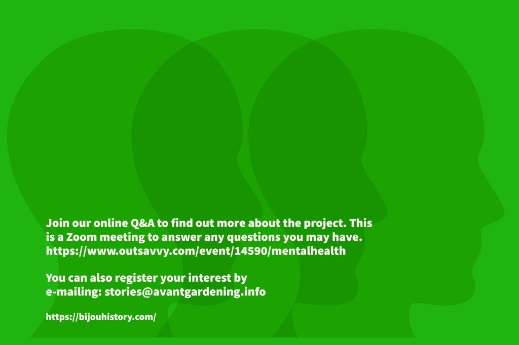 Avant-Gardening CIC/Bijou Stories will be running a number of drop-in sessions where you can help to plan, storyboard, film, or star in a short promo film that signposts mental health services available in the Borough of Greenwich. You do not need to have any experience as the project will be based on informal, friendly sessions with a strong social vibe!