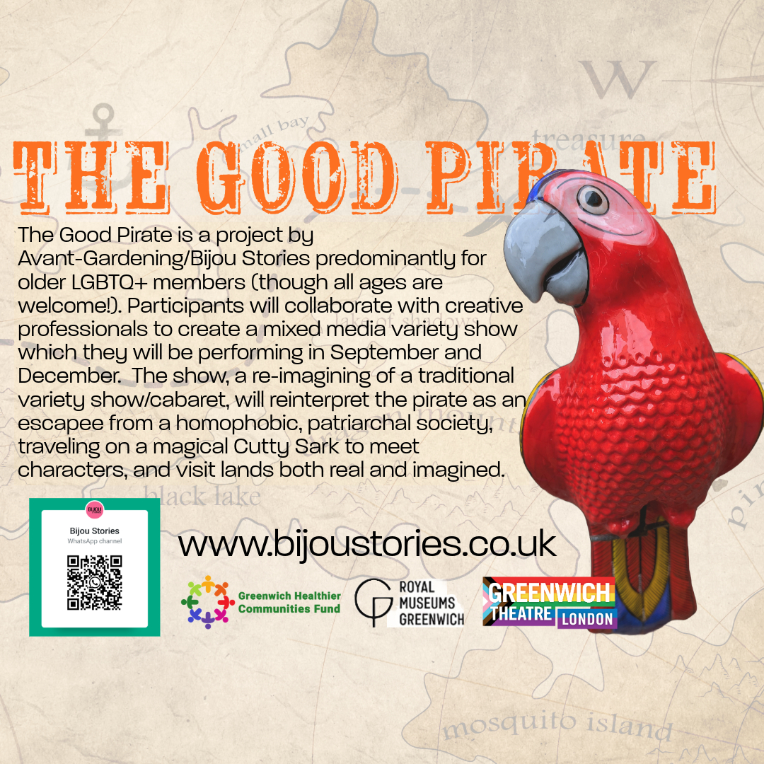 Bijou Stories are now beginning to get things ship shape ready for their maiden voyage on board The Good Pirate. As well as workshops and activities at the National Maritime Museum we are going to be collaborating with Meet Me at the Albany for four sessions during the summer. Our sessions are open to all, with a focus on members of the LGBTQ+ community over 55. We will be running workshops that will help participants create performances to be performed in two unique shows celebrating LGBTQ+ history through music, monologues and moments of piratical fancy.
