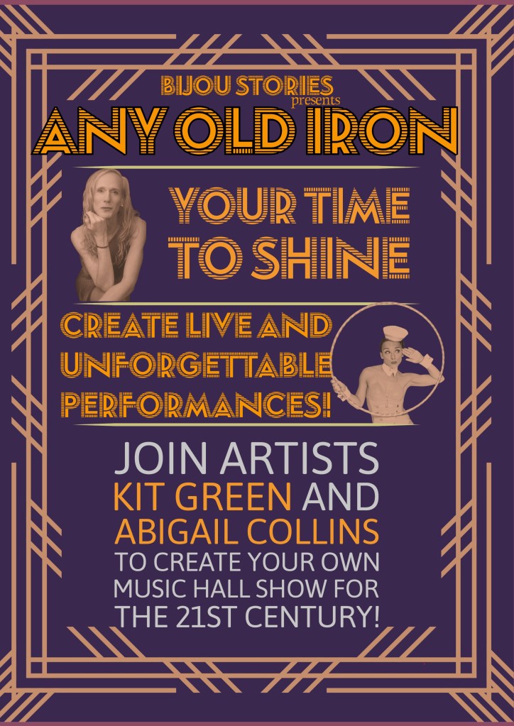 Any Old Iron is the latest project from Avant-Gardening/Bijou Stories and once again invites participants to explore local and cultural histories and to share their own story in a co-created performance. For this project we are looking at popular culture through the tradition of music hall and exploring LGBTQ+ presence in this influential form of entertainment, which later morphed into variety shows and cabaret. Through a programme of fun and highly social workshops including movement and dance, singing, creative writing and filmmaking, participants will create their own performances, either solo or group, which will be featured in the show they will co-create for Greenwich Theatre in the autumn. Our target demographic is primarily older members of the LGBTQ+ community, including those that have lived experience of mental health challenges. But, we also welcome younger people to help create an inter-generational dialogue as we explore the haunted theatre of music hall.